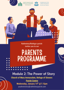 The second module of our Parents Programme will be on Wednesday, 14th January at 7.15pm in Rathmines Parish Centre. Stories help us to learn and remember, and they are very much the beating heart of our human experience.